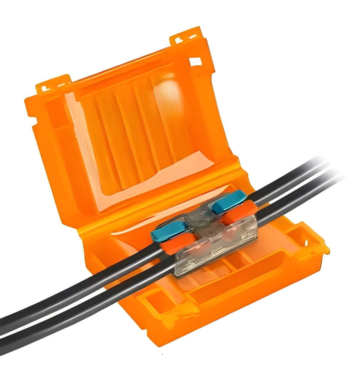 Waterdichte gelbox met 2-Pins INOUT WAGO. Geïsoleerde gelgevulde waterdichte box geschikt voor wago lasklemmen. Ideaal om waterdicht kabels te verbinden.