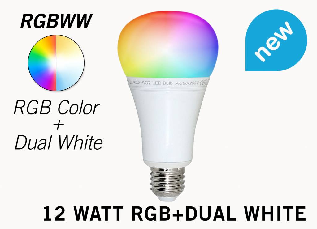 Nieuw! Dimbare 12 Watt RGB Kleur + Dual White LED lampen van Mi-Light met grote fitting (E27). Complete set inclusief Wi-Fi box met APP en extra RF afstandsbediening. In te stellen op een kleur, een pastel mengkleur en ook op Dual White variabel van warm