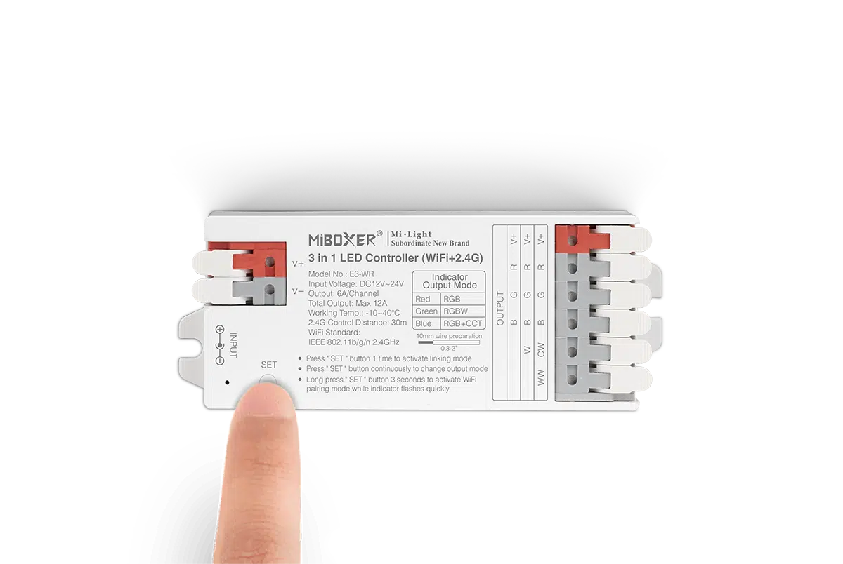 De MiBoxer E3-WR is een krachtige 3‑in‑1 LED controller voor RGB, RGBW en RGB+CCT LED strips. Met één controller kun je kiezen tussen kleurrijke RGB‑effecten, RGBW met extra witkanaal of volledige RGB+CCT besturing met zowel kleur als instelbare wittemperatuur.
