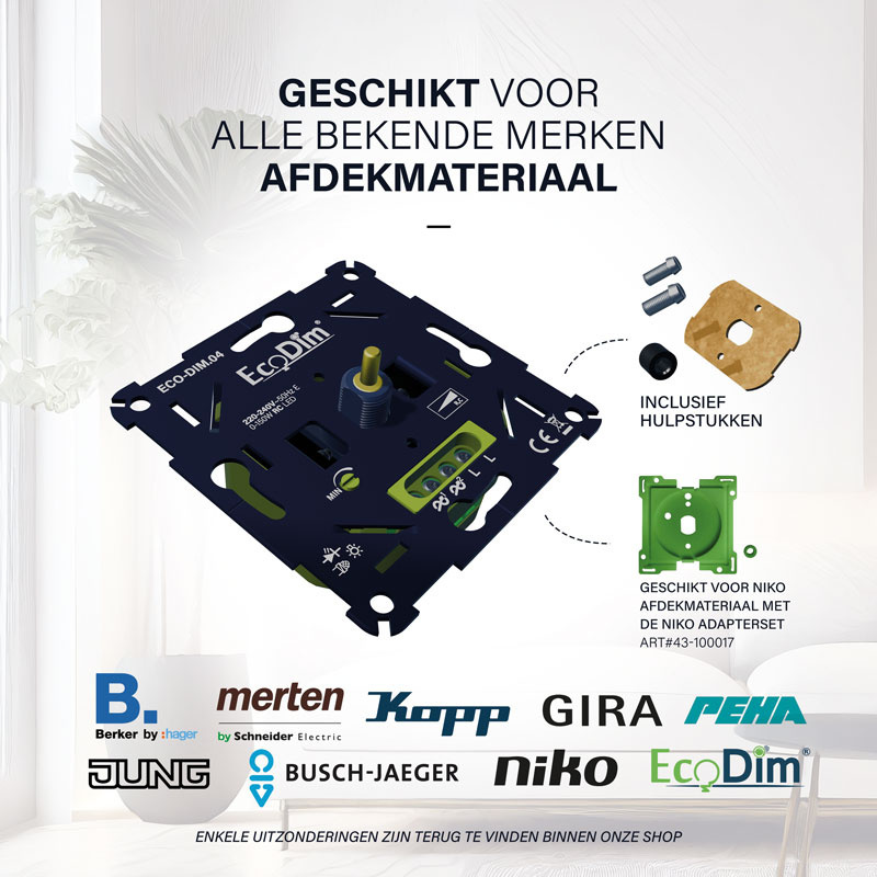 Deze LED dimmer is compatibel met alle A-merk afdekmaterialen. Met een bereik van 0-150 Watt is de dimmer geschikt alle LED lampen die fase afsnijding nodig hebben. De ECO-DIM.04 is een product van hoge kwaliteit.