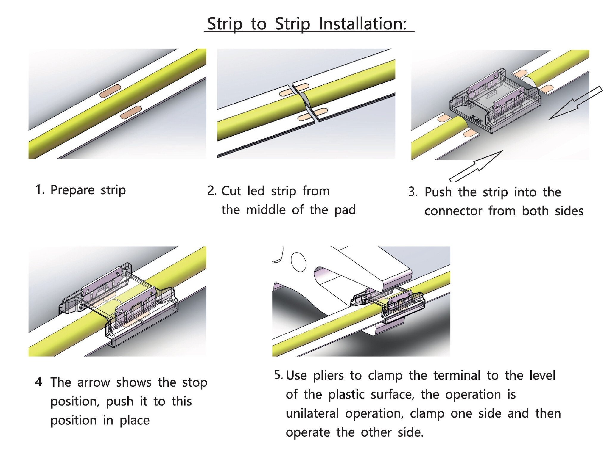 Met dit koppelstuk kunt u eenvoudig delen van een IP68 Waterdichte Dual White CCT of RGB COB LED strips verlengen zonder te hoeven solderen. Beide stukken ledstrips aan elk één kant van de connector inschuiven en de verticale metalen verbindplaatjes bovenaan de connector één voor één met een tang in de ledstrip knijpen.