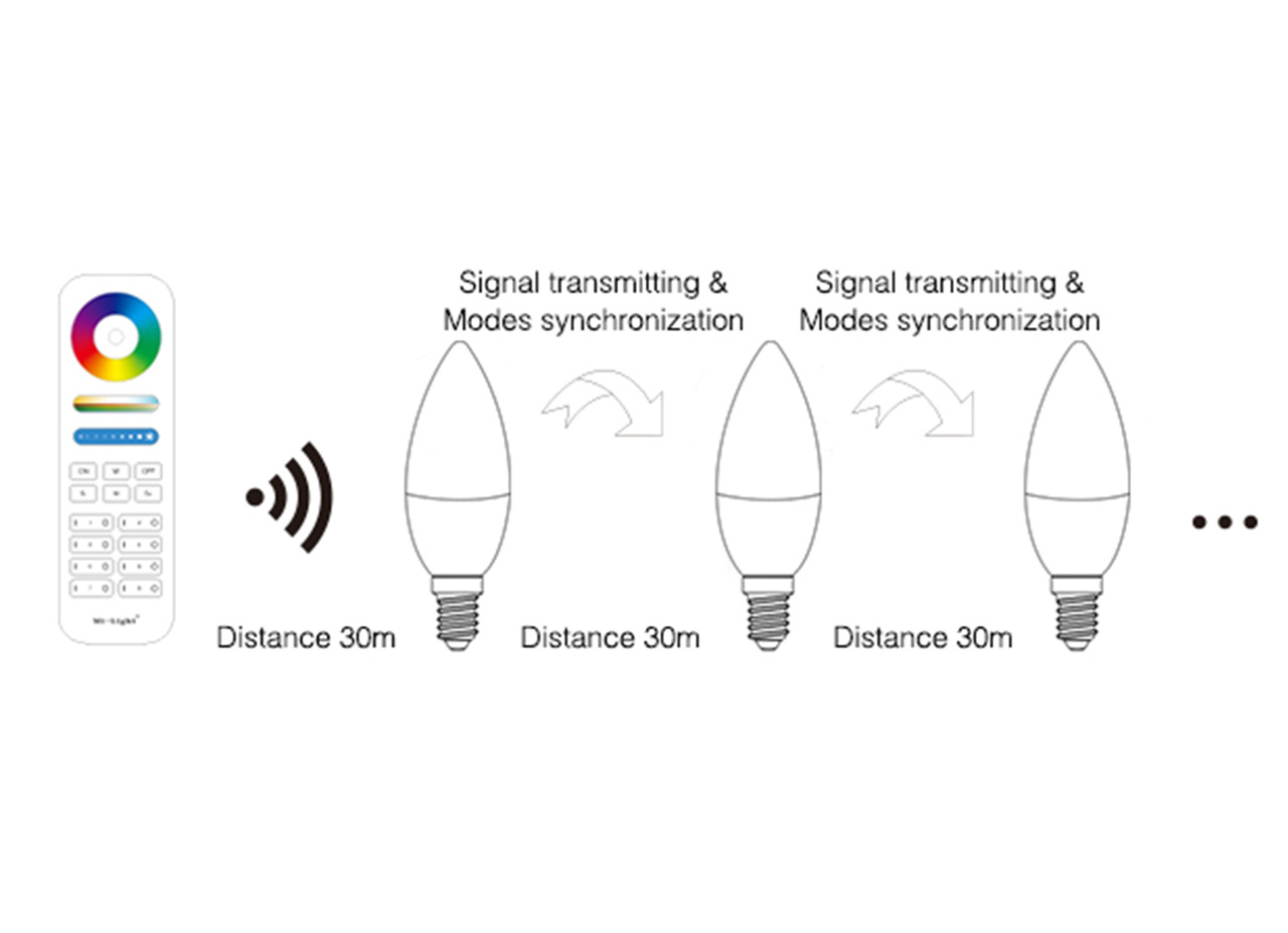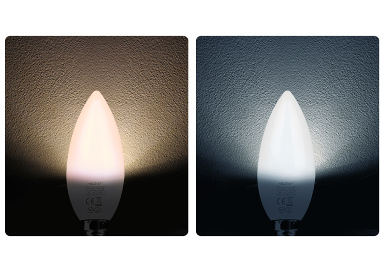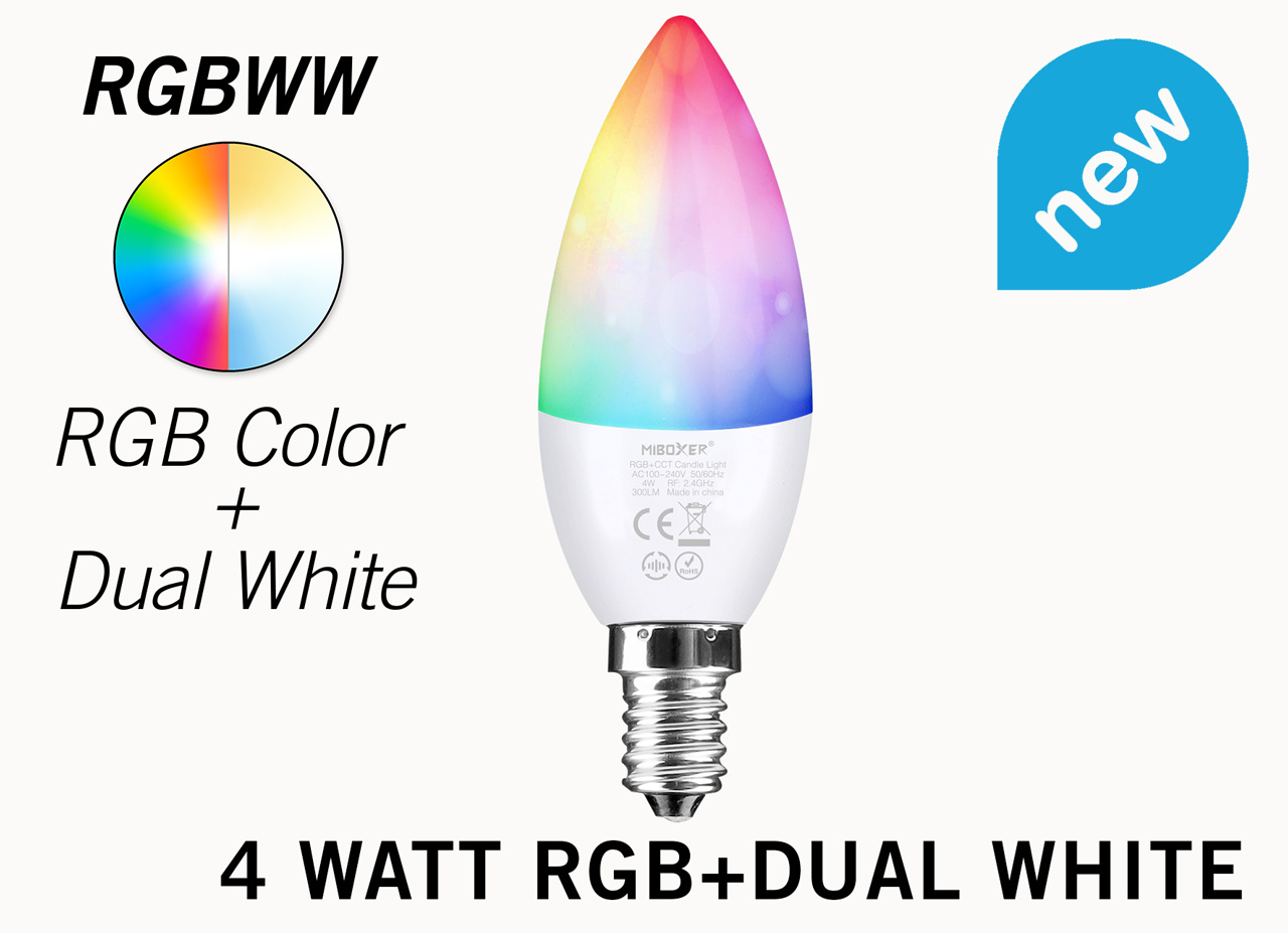 Nieuw! Deze Mi-Light LED kleur + Dual White kaarslampen geven naast alle RGB kleuren ook wit licht met variabel in te stellen kleurtemperatuur van warm wit naar neutraal tot koel wit. Ook is de saturatie van het kleurlicht te regelen, waardoor u niet alleen verzadigde volle kleuren kunt maken maar ook mooie pastel tinten.