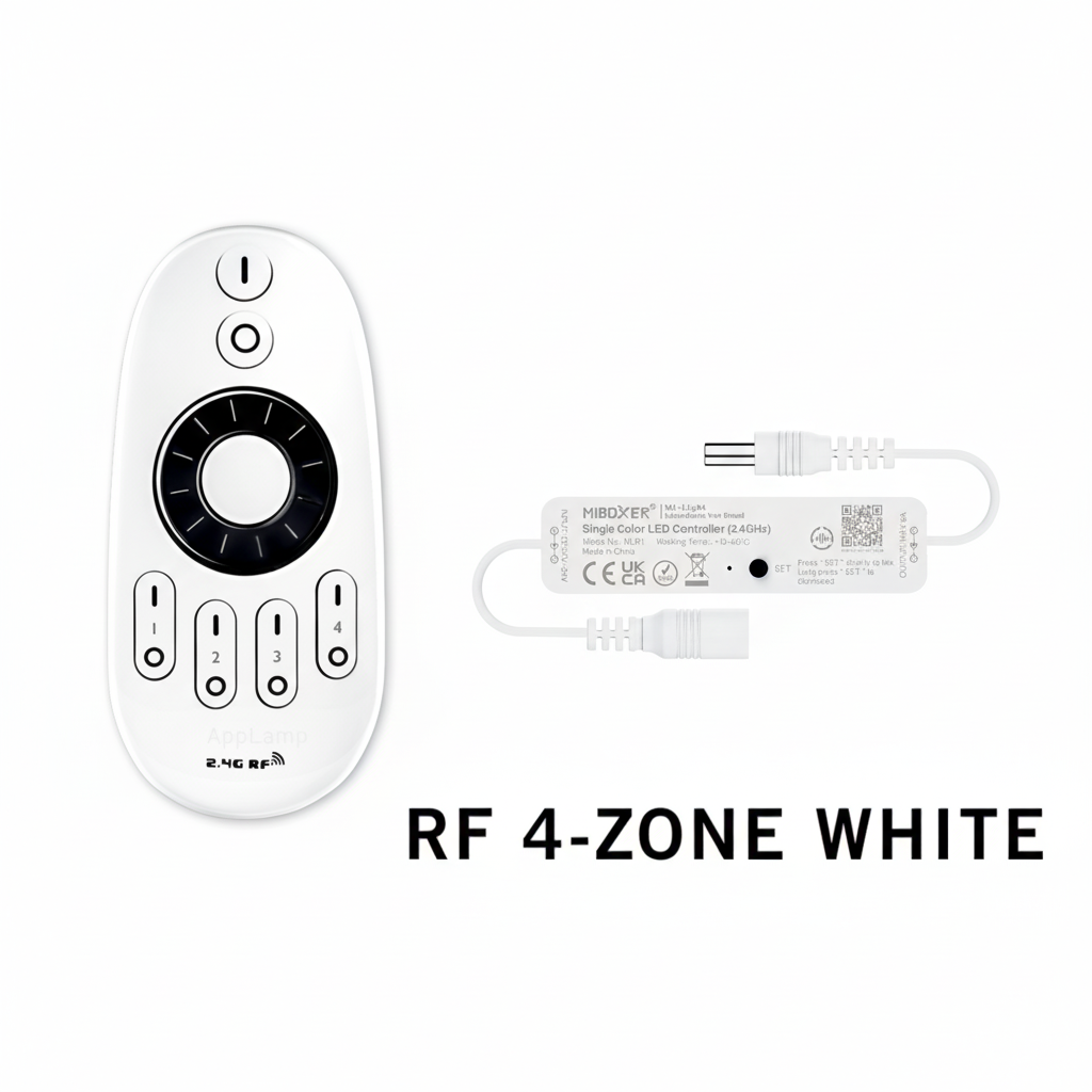 Milight mini led strip controller met RF afstandsbediening voor het dimmen van enkelkleurige of witte led strips. Met Jog Shuttle 4-zone afstandsbediening tot 30m bereik. 72W bij 12V of 144W bij 24V. Compatibel met optionele Wifi Box voor App bediening.