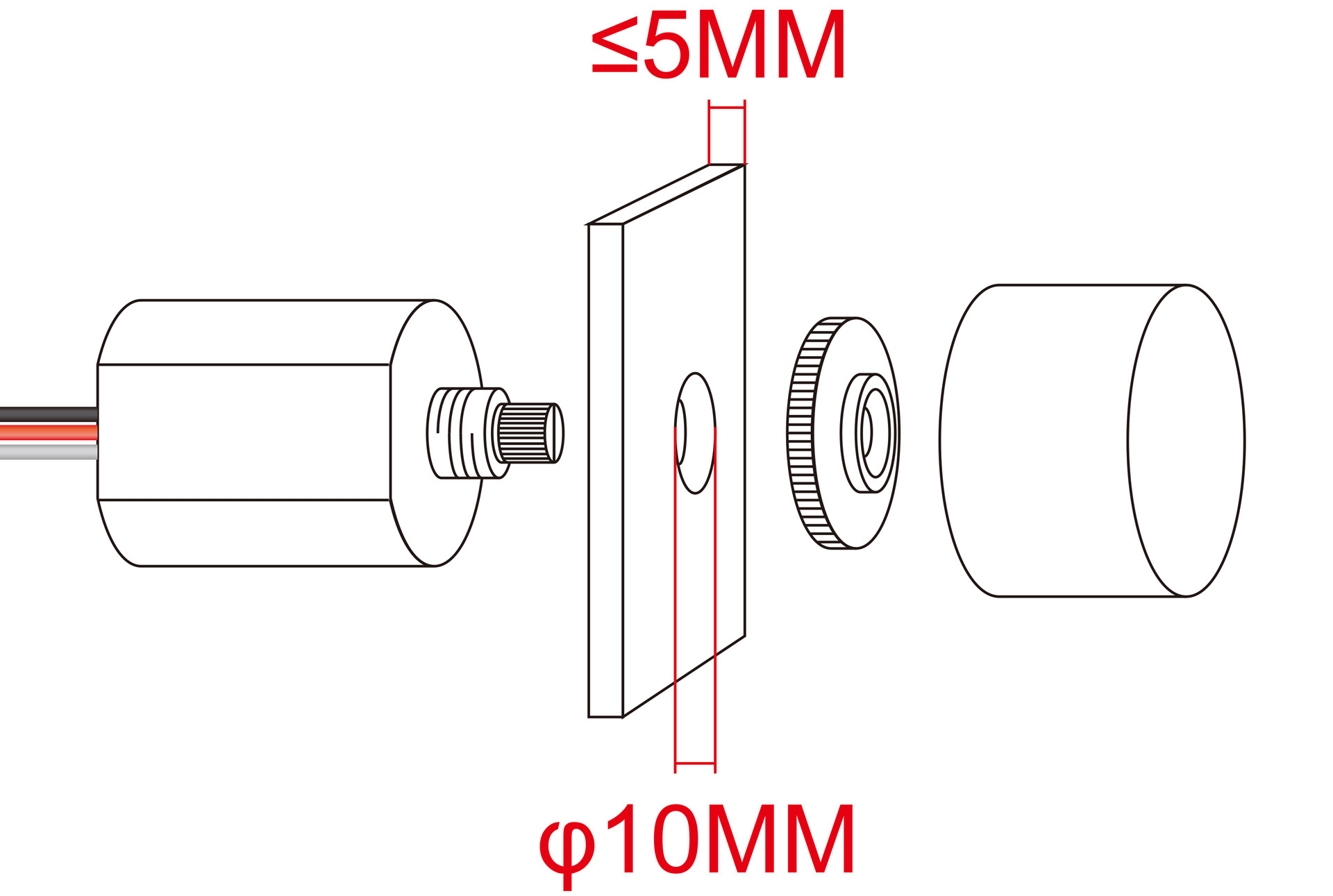 De knop kan worden ingebouwd in een paneel van maximaal 5 mm dikte en is voorzien van 30cm aansluitdraden.