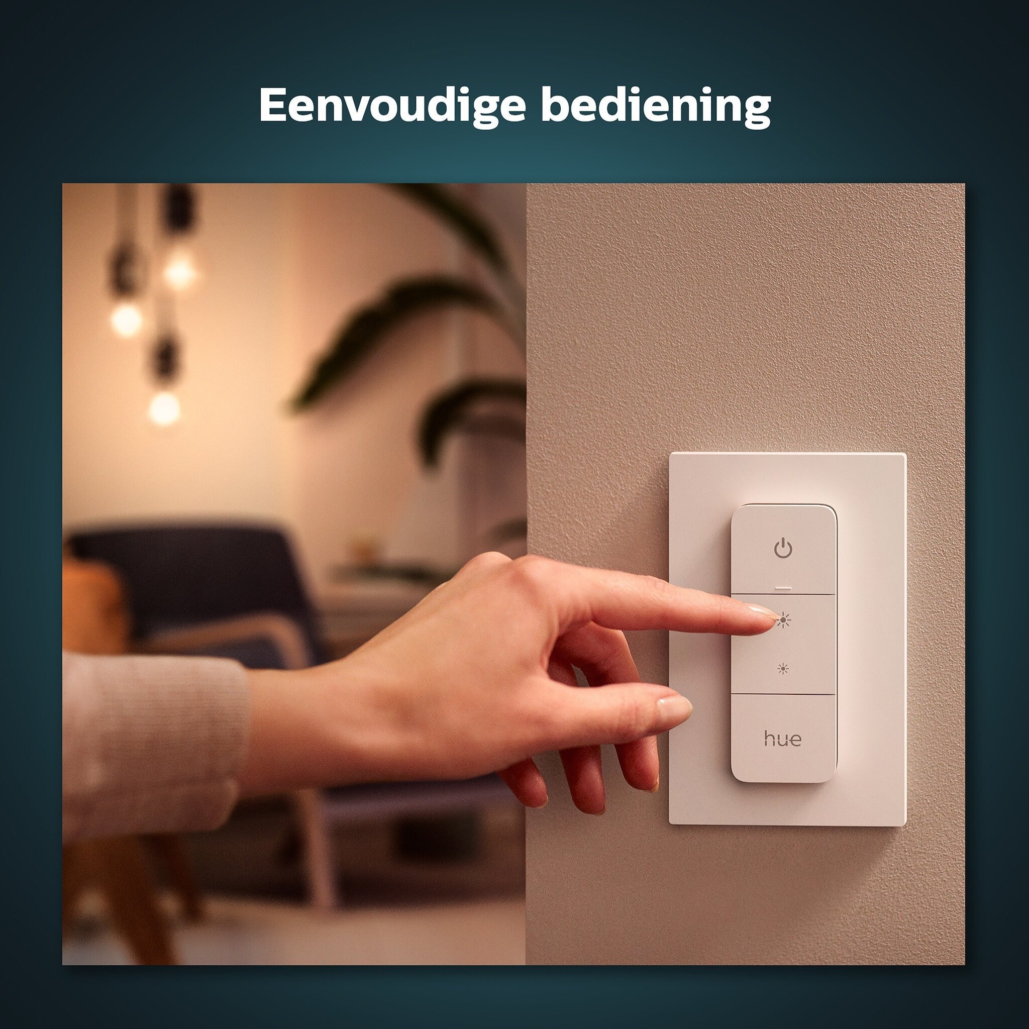 De Philips Hue dimmer switch is een ontzettend slimme schakelaar voor je Hue lampen. Zet je lampen feller, dim ze, blader door lichtscènes of stel het licht in dat het beste past bij het moment van de dag. Je kunt deze slimme schakelaar gemakkelijk aan de muur bevestigen of de magnetische achterkant gebruiken. Of schroef de wandhouder op de muur om een bestaande lichtschakelaar te vervangen. De wandhouder is breed genoeg zodat je hem mooi kan wegwerken over je bestaande schakelaaropening, zonder rare rafelrandjes. En hij werkt helemaal draadloos! Haal de dimmer switch eenvoudig van de wandhouder en gebruik hem als handige afstandsbediening om je slimme lampen te bedienen. Heb je al een Hue Bridge? Dan kun je via de Hue app de instellingen van de dimmer switch helemaal naar smaak aanpassen, precies zoals jij het wil.