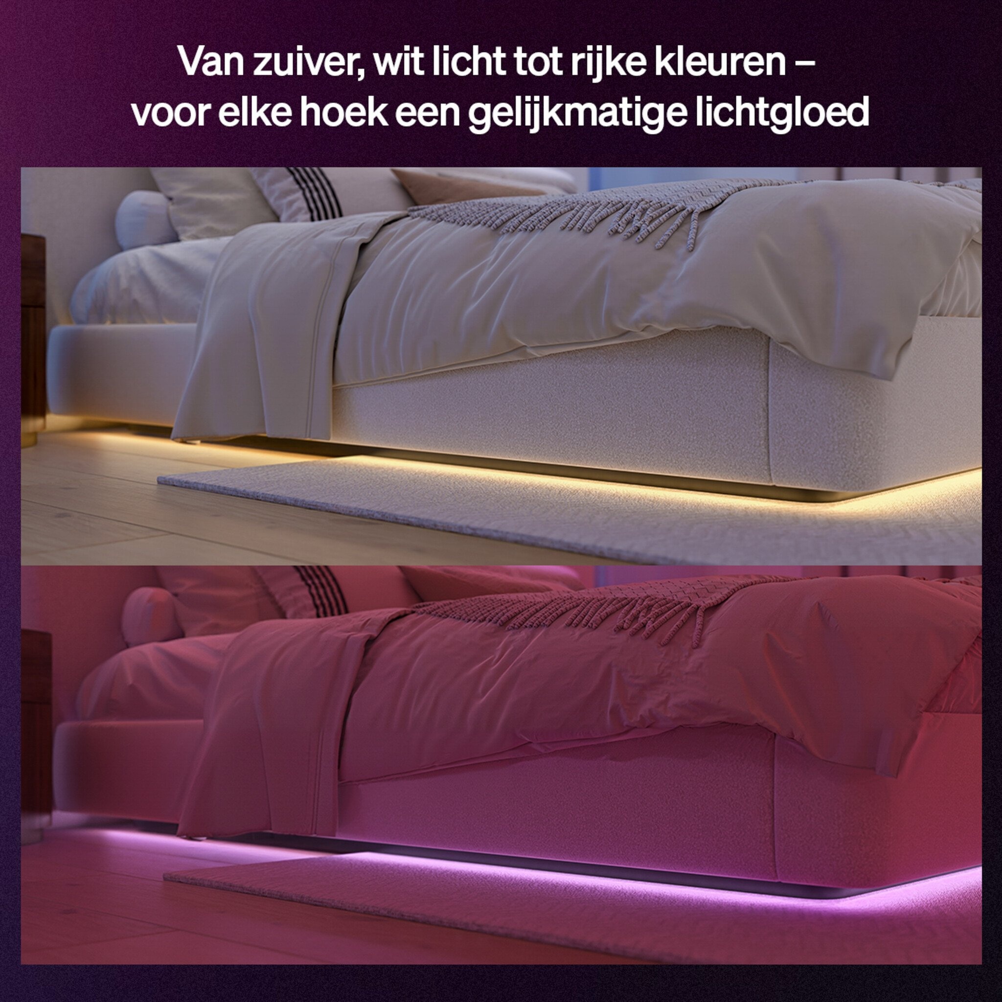 Kies uit miljoenen kleuren, sfeervol wit licht of verschillende tinten wit om elke ruimte de juiste uitstraling te geven. Dankzij de diffuse gloed die over muren, vloeren en plafonds straalt, creëer je moeiteloos de perfecte ambiance. Chromasync™️-technologie zorgt voor nauwkeurige, consistente kleuren en vloeiende overgangen – vanuit elke hoek. Personaliseer je ruimte met prachtige lichtscènes en dynamische effecten die passen bij elk moment. De lichtstrip is flexibel, op maat te knippen en uit te breiden – perfect voor muren, hoeken, plafonds of trappen.