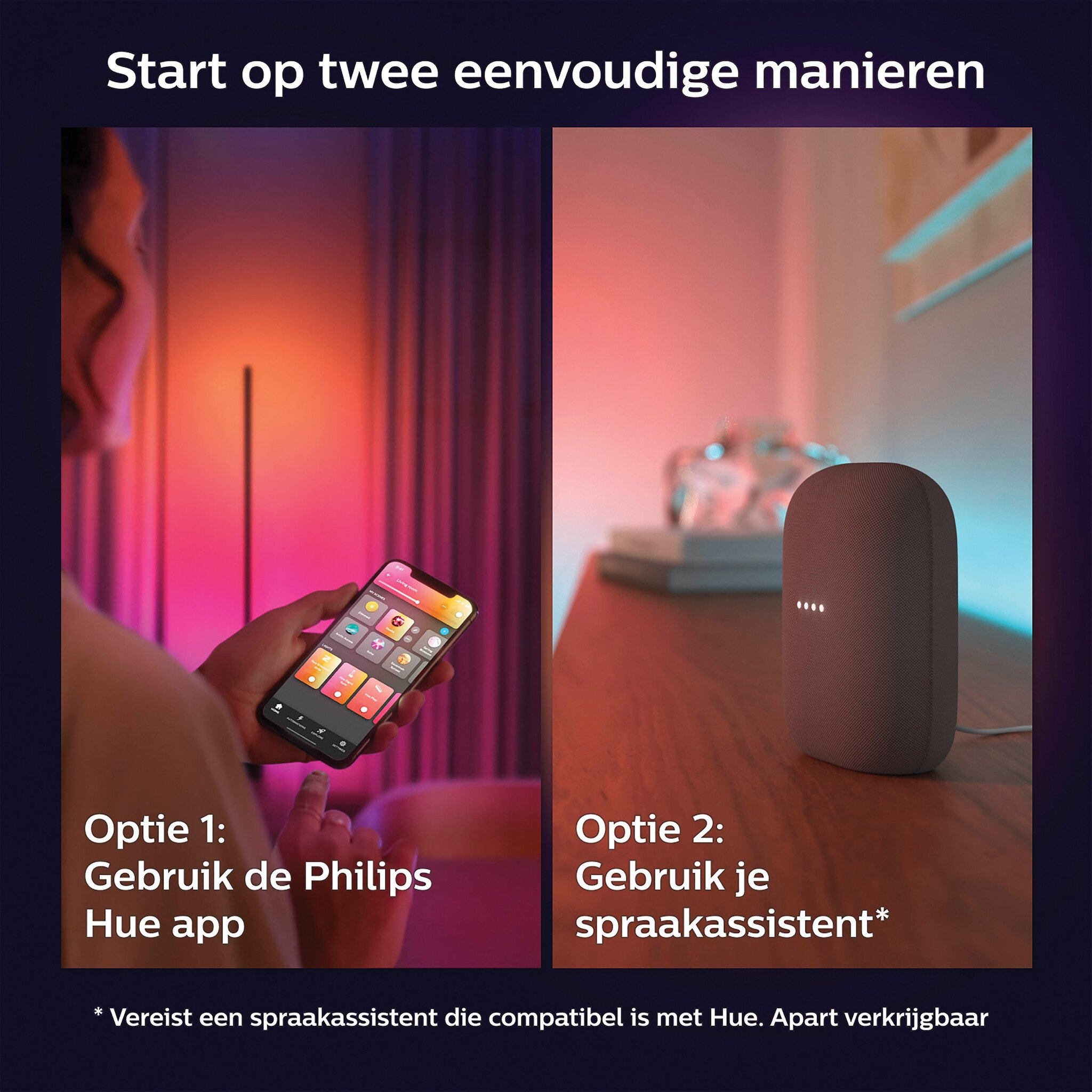 Transformeer je huis met meer dan 16 miljoen kleuren en creëer onmiddellijk de juiste sfeer voor elke gebeurtenis. Met een tik op een knop verhoog je de feeststemming op een feest, verander je je woonkamer in een filmzaal, breng je de inrichting van je huis tot leven met kleuraccenten en nog veel meer.
