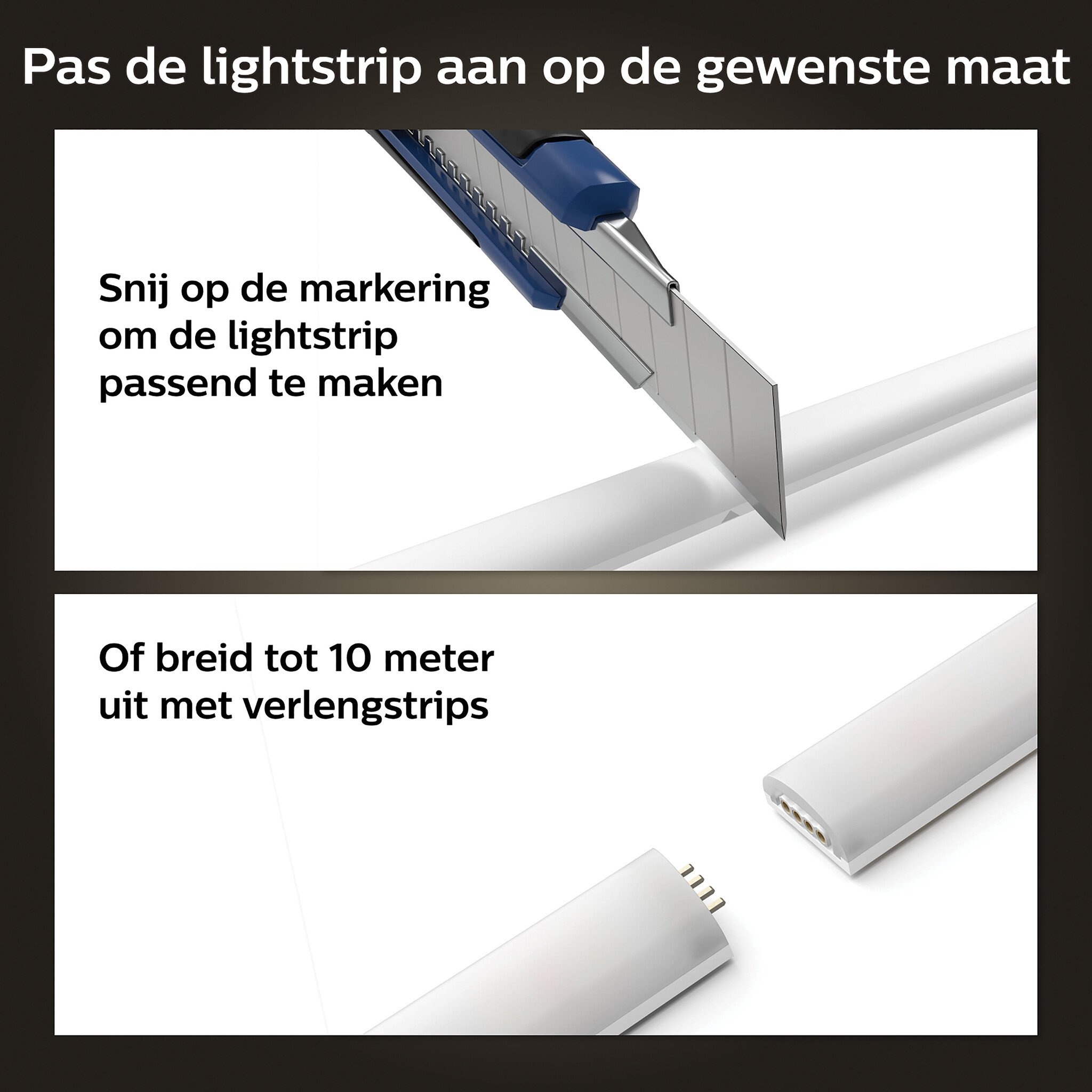 Verleng je Philips Hue ambiance gradient lightstrip tot 10 meter met verlengstrips van 1 meter om een breder gebied te schilderen met een kleurrijke mix van licht, zoals in een nis of onder een bed.