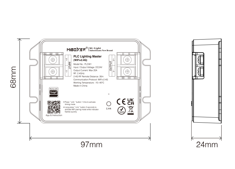 De MiBoxer PLCW1 is een PLC (Power Line Communication) Lighting Master. In plaats van aparte signaalkabels of alleen draadloze controllers verstuurt dit systeem besturingsdata rechtstreeks via de 24V voedingslijn. Daarmee is de PLCW1 ideaal voor toepassingen waar normale RF- of WiFi-signalen moeilijk doorkomen, zoals zwembaden, buitenvloeren, tuinpaden en ingegraven armaturen.