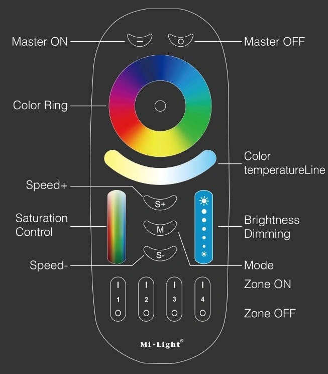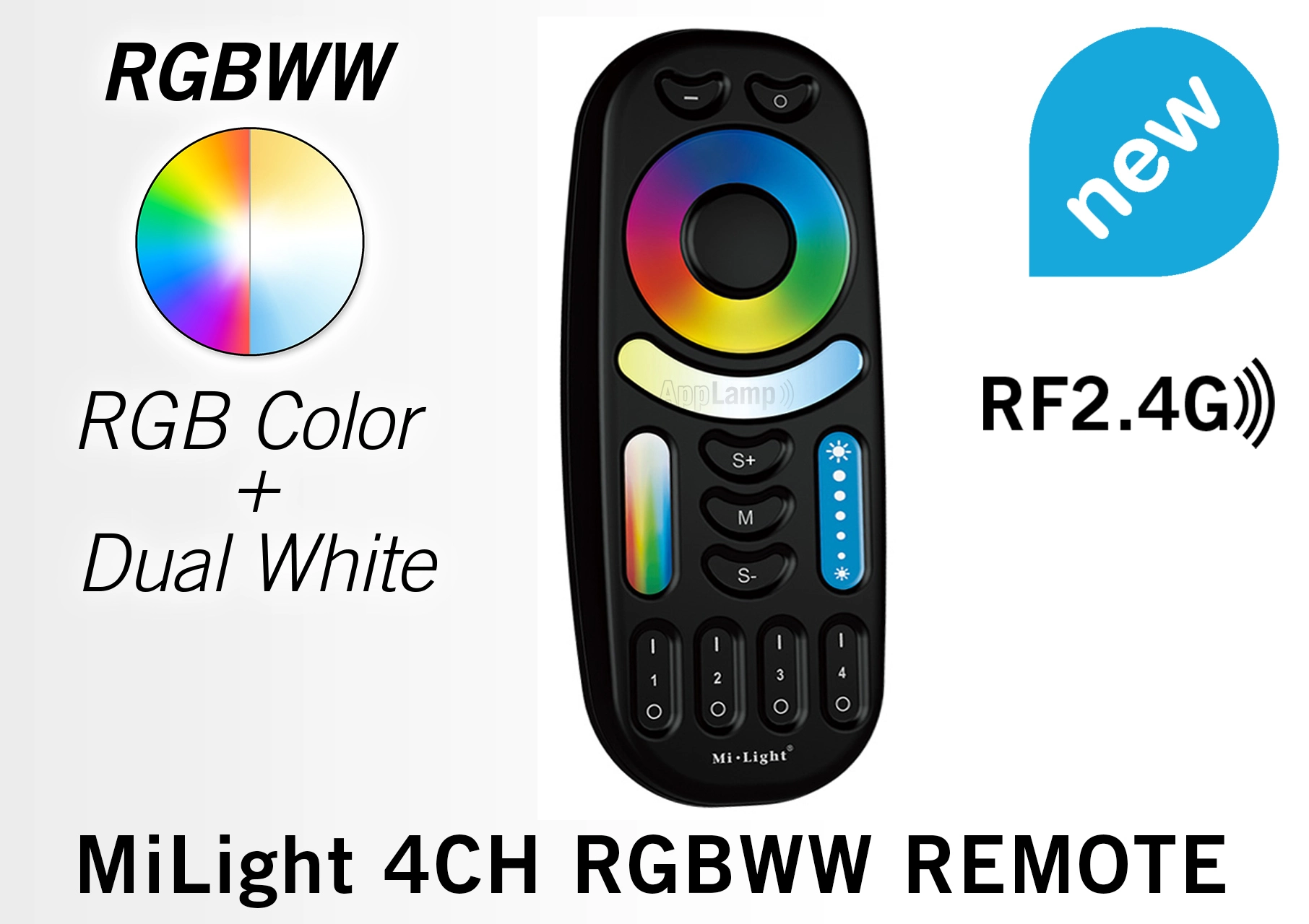 Afstandsbediening voor de nieuwe RGB kleur en Dual White Mi-Light LED verlichting. Met deze afstandsbediening kan u de nieuwste RGB+Dual White lampen van koel tot warm wit instellen alsook de saturatie regelen.